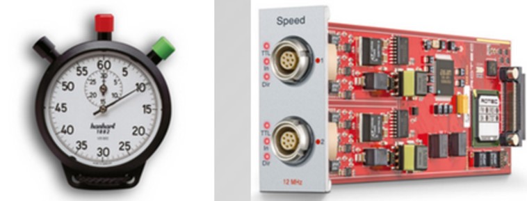 高分解のストップウォッチは回転速度計測ボードの一部です。エレクトロニクスのストップウォッチはマニュアルのストップウォッチよりはるかに速い12.3 GHzのクロック周波数で動作する“タイムカウンター”です。この高周波クロックは結果として大変細かい時間分解能になります。