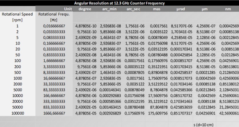 上の公式とRotecの回転速度計測ボードのクロック周波数12.3 GHzを使用すると、以下値が回転速度に依存した角度分解能として得られます。
