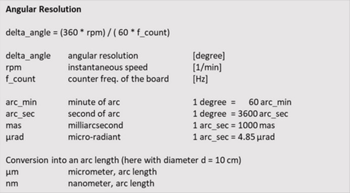 これが角度分解能です。これは一定ではありませんが、変動する回転速度と、クロック周波数のような一定時間分解能に依存します。これはまた、角度分解能が1回転当りの計測数に全く依存しない事に注意が促されます。