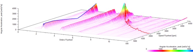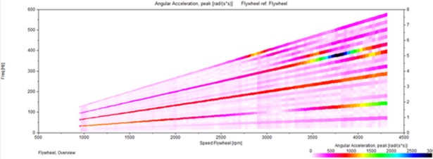 捩れ振動の高次数はドライブトレーンのような特別な構成部品における高調波振動、あるいは、欠陥を示しているかもしれません。これらの次数を解析する事で、技術者はどの部品が最も捩れ振動へ影響を及ぼしているかをピンポイントで指し示し、それらを減らす為のターゲットアクションを取ることができ、最適な機械性能と寿命を確保する事ができます。