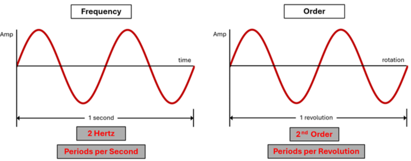 これらの次数は特定の振動現象を回転速度と関連付けて技術者を支援し、より正確な解析を可能にします。捩れ次数を計算するには正確なデータ計測と周波数スペクトラムと基本周波数に関連する各々の振動事象の次数を解析する事ができるソフトを使用する事が要求されます。左図は1秒間の周期事象で、右図は1回転の次数事象です。例えば、エンジンが600 rpmで2次の振動を持つなら、振動周期は20 Hzとなります。