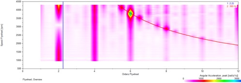捩り振動次数は基本回転速度の倍数であり、振動源を特定する上で手助けになります。エンジン解析では、捩り振動次数は回転毎の重要なトルクパルス数を表します。例えば、4シリンダエンジンにて、2次は一般的に燃焼事象に対応しており、振動源を理解する為にキーとなる診断ツールとなります。