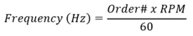 捩り振動次数は特定の振動事象の周波数を基本的な回転周波数(RPM)で割算する事で計算されます。例えば、シャフトが600 rpm(10Hz)で回転し、振動が20 Hzで発生しているなら、次数は1秒毎になるように計算されます。